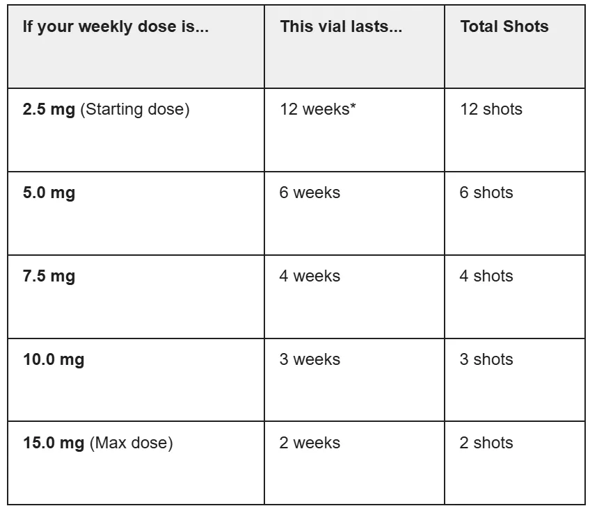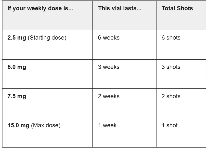 The number of shots you can get from a vial depends entirely on your current weekly dose. Since tirzepatide is typically titrated (increased) every four weeks, a single vial might last you a full month or just one week, depending on where you are in your treatment.